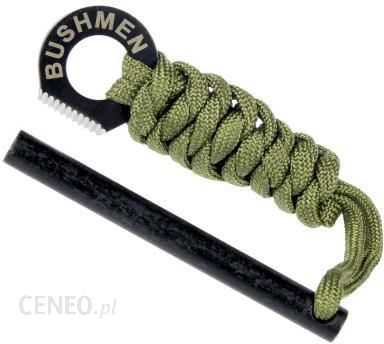 Krzesiwo Rebel Bushmen Olive, źródło ognia + 100 cm linki paracord Wyjątkowe krzesiwo z solidnym rdzeniem o średnicy 8 mm i długości 80 mm. Posiada wygodny, krótki iskrownik, który w połączeniu z mocnym kawałkiem linki paracord daję nam niezastąpione źródło ognia w ekstremalnych sytuacjach. Krzesiwo Rebel ma prosty kształt ze splotem, który umożliwia krzesanie iskier bez rozplątywania paracordu, a jednocześnie zapobiega dzwonieniu iskrownika o krzesiwo. Iskrownik posiada ząbkowane ostrze do krzesania oraz przygotowywania rozpałki. Jego kształt zbliżony do główki klucza, daje pewny i wygodny chwyt, a jednocześnie umożliwia podpięcie go np. do kluczy. Linka z siedmio rdzeniowego paracordu ma długość około 1 metra akurat by coś awaryjnie związać, czy np. wymienić pękniętą sznurówkę. Linka może służyć również jako miarka (może niezbyt dokładna, ale zawsze). Otwór w rdzeniu pozwala uchwycić krzesiwo przetykając przezeń gałązkę lub załączoną linkę. Umożliwia również zamocowanie własnego chwytu. Specyfikacja produktu: Wymiary rdzenia: 8 mm średnicy i 80 mm długości Wymiary linki paracord: 100 cm Źródło ognia Wygodny i krótki iskrownik Zapobiega nadmiernemu dzwonieniu Dobry chwyt Otwór w rdzeniu Producent: Bushmen